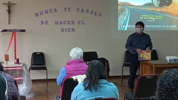 La actividad se inició con la bienvenida, luego hubo un espacio dedicado a la oración con el Evangelio del día, y continuó “con un momento de aprendizaje y de profundizar cómo analizar un texto bíblico para llevarlo a la práctica en la clase, tema que entregó en esta oportunidad el padre José Miguel Alvarado Bustamante SVD”, dijo la Delegada para la Comisión Pastoral de Educación, Karina Valenzuela.