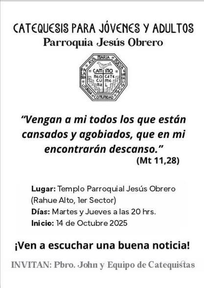 Con una invitación del evangelio de Mateo: "Vengan a mí todos los que estais cansados y agobiados, que en mí encontrarán descanso" (Mt 11, 28) , el equipo de catequistas y el Padre John Jairo, quienes presidirán estas charlas, invitan a participar durante todos los martes y jueves a las 20 hrs.