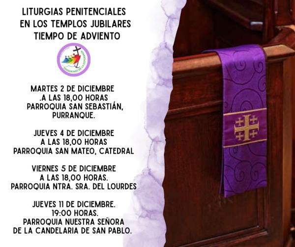 Para ayudarnos en esta espera, y como cierre de este jubileo, los templos jubilares de la diócesis de Osorno han preparado liturgias penitenciales para fomentar este espíritu de perdón y reconciliación en este tiempo de la llegada del Nacimiento de Jesús, en lo que detallamos a continuación el día, hora y lugar.