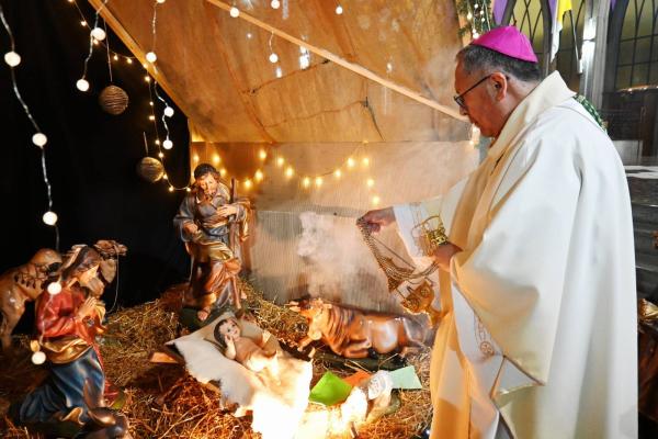Al inicio de la celebración, se vivió un emotivo momento con la procesión del Niño Jesús hasta el altar; gesto que culminó al finalizar la misa, cuando Monseñor lo dispuso en el pesebre, simbolizando el nacimiento del Salvador.