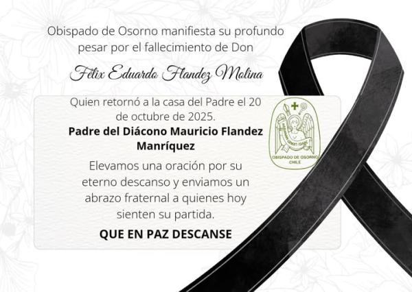Obispado de Osorno comunica con profundo pesar el fallecimiento de Don Félix Eduardo Flández Molina, quien ha retornado a la Casa del Padre el día 20 de octubre de 2025.
