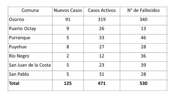 Otros 125 nuevos casos se reportaron en la Provincia de Osorno para este martes